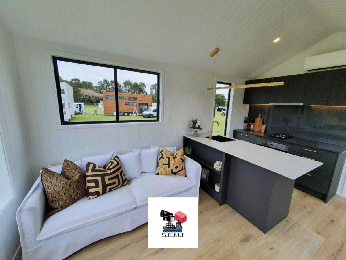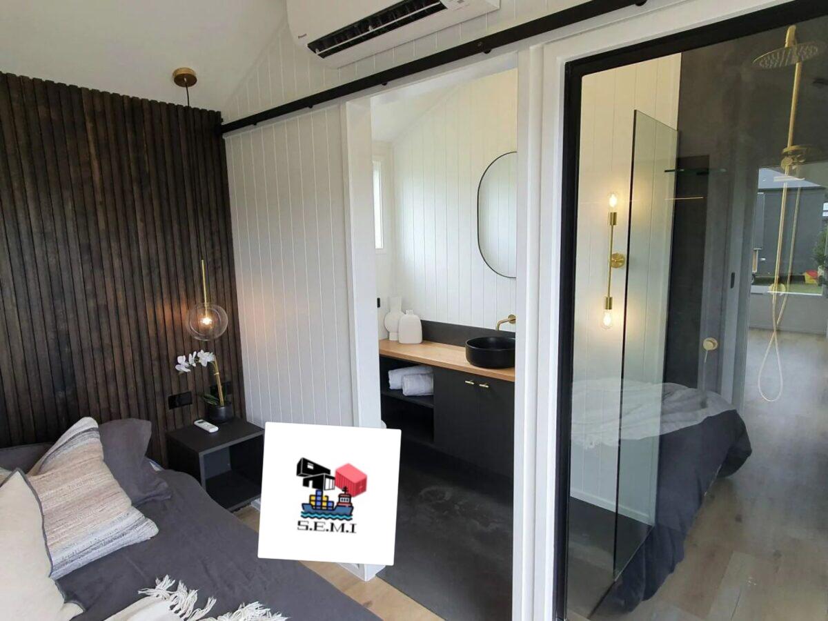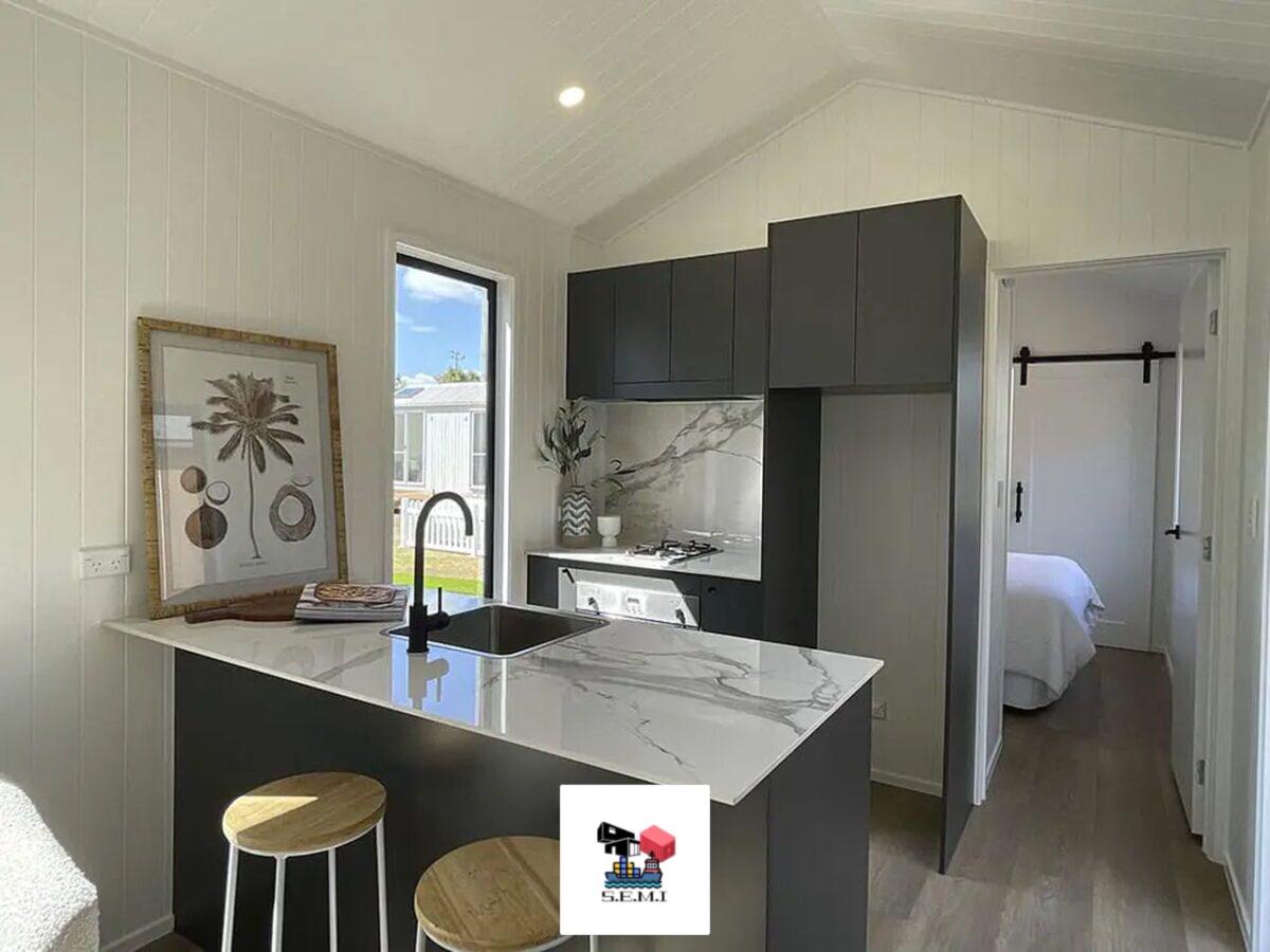 A casa móvel T1 NAPOLI com dois modelos de um quarto em branco e preto tem um espaço confortável para relaxar, com espaço para uma televisão e um balcão de pequeno-almoço. Um colchão queen-size.