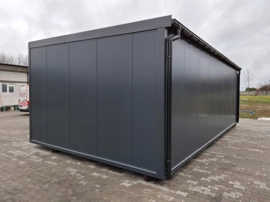 Ce module est un bungalow préfabriqué de type bureau ou habitation légère, composé d'une structure en panneaux sandwich avec une finition extérieure moderne, combinant des éléments en acier peint (gris anthracite) et des lamelles en bois décoratif.